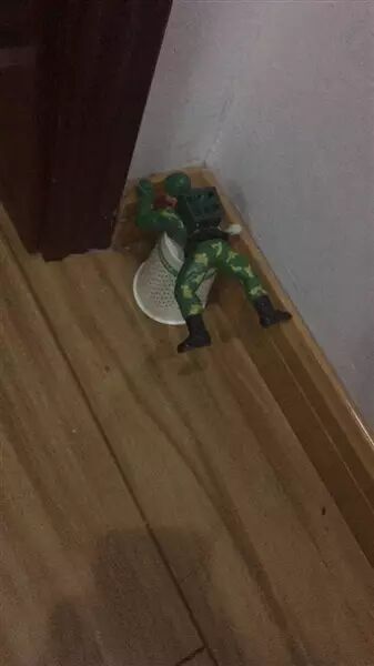 一个纸杯倒扣,上面横放着一个匍匐的玩具士兵