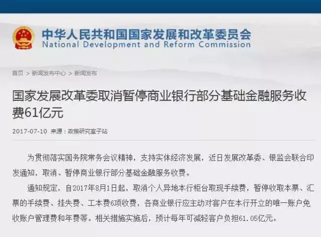通知规定,自2017年8月1日起,取消个人异地本行柜台取现手续费,暂停收取本票、汇票的手续费、挂失费、工本费6项收费,各商业银行应主动对客户在本行开立的唯一账户免收账户管理费和年费等。各商业银行应通过其网站、手机APP、营业网点公示栏等渠道,以及在为客户办理业务时,主动告知提示客户申请指定免费账户。客户未申请的,商业银行应主动对其在本行开立的唯一账户(不含信用卡、贵宾账户)免收年费和账户管理费。