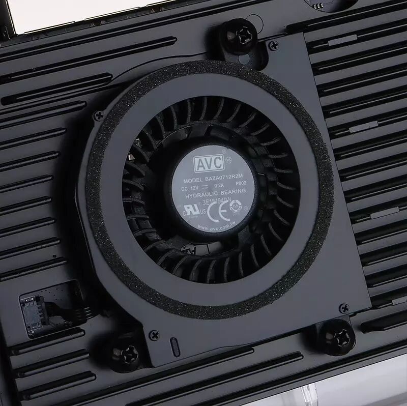 ▲内部散热靠的是这个AVC涡轮散热器,它采用的涡轮风扇能在较小的空间中带来相对更大的风量,散热片的面积也足够大,覆盖了整个硬盘。