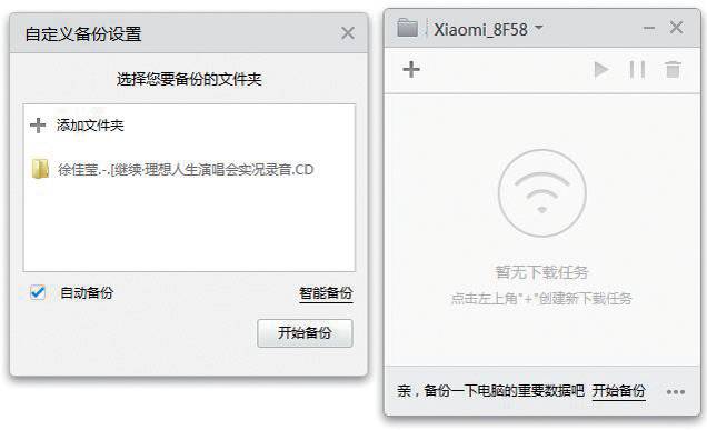 全新小米路由器真正有可玩性的地方其实都在它的客户端上。官网提供了包括Windows、Android、iOS和OSX在内的版本。其中PC客户端相对简单,它能提供的功能基本就是备份、下载。备份则有自定义备份和智能备份两种模式。不过就体验来看,智能备份显得太过笼统,不算好用。备份的速度上,在传输无损音乐、视频等较大的文件时,硬盘的写入速度保持在12MB/s左右。下载支持常用的磁力链接、BT种子,当然传统的http下载也行。在联通20M带宽下,其下载速度能达到带宽的上限,表现不错。