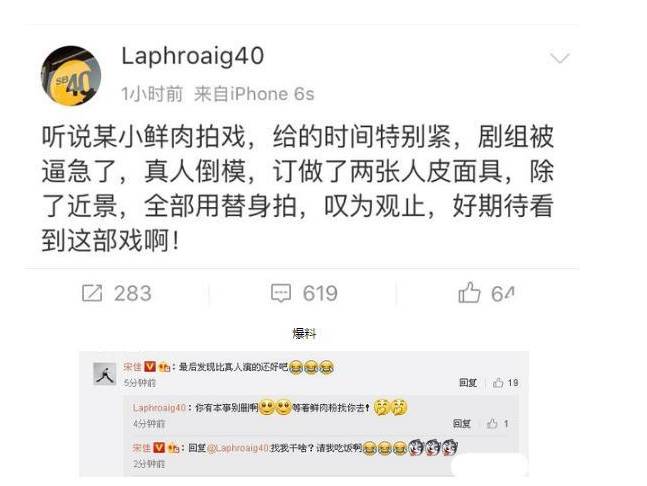之前有微博博主“Laphroaig40”爆料有小鲜肉不敬业,拍戏给的时间紧,剧组只能用真人倒模,订做了两张,当替身拍摄。随后小宋佳在其微博评论,调侃:“最后发现比真人演的还好吧”,。