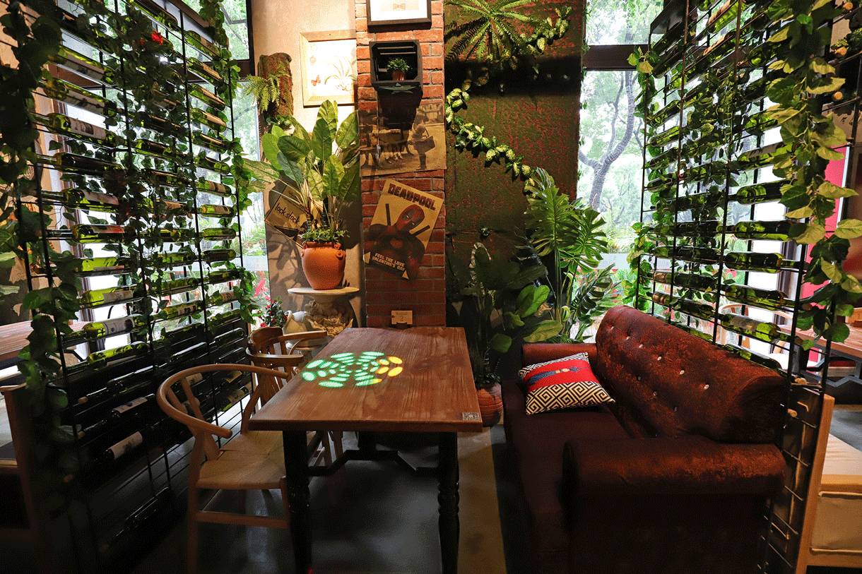 无论是中国还是欧洲,酒文化与诗歌文化互为交融,庞客打造烘托出“自在饮酒”、“有酒有诗”的氛围。因此“酒瓶”也成为一种装饰融入其中。