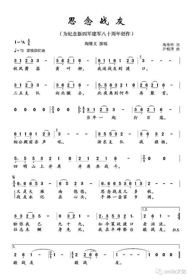 歌曲《思念战友》是为纪念新四军建军80周年创作的一首作品,由陶寿林作词,尹相涛作曲,阎维文演唱。歌曲以战斗在浙江四明山一带的新四军三五支队为切入点,以一位新四军老战士的视角,深情回忆战斗历史,深切思念牺牲战友,重温那段光辉的岁月,表达了人们对新四军光荣革命历史的无限崇敬。