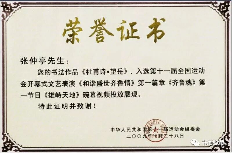 2009年,其书法杜甫诗《望岳》在张仲亭本人不知情的情况下被第十一届全国运动会开幕式中央电视台主创团队选用,在全运会文艺表演《和谐盛世齐鲁情》第一篇章《齐鲁魂》第一节目《雄峙天地》碗幕视频中投放展示。十一运后,第十一届全国运动会组委会和中央电视台主创团队为其颁发了荣誉证书。