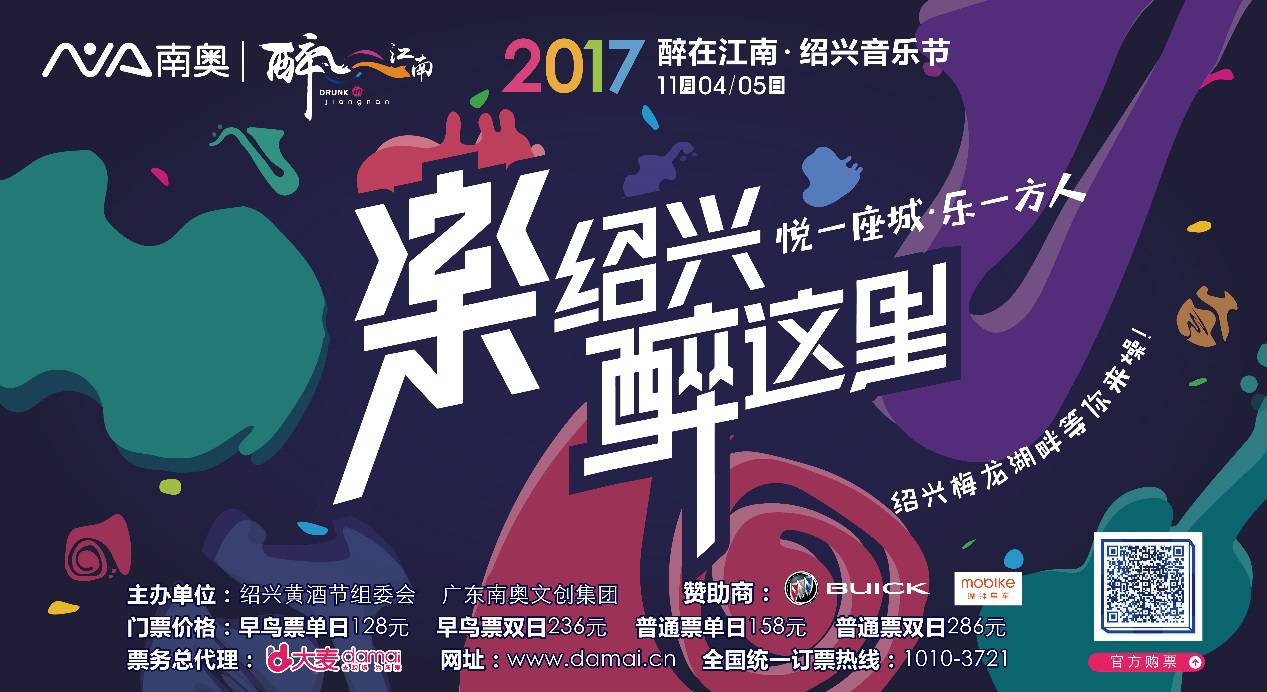 ✪ “醉在江南·绍兴音乐节”将在11月4日-11月5日在绍兴梅龙湖畔率先引爆。音乐节邀请国内炙手可热的演出阵容,如《中国有嘻哈》总冠军GAI、首届《快乐男声》总冠军陈楚生与他的乐队SPY.C、马頔、后海大鲨鱼、满舒克、万能青年旅店、重塑雕像的权利等。现场另一重头活动是以螃蟹黄酒绝配为题的蟹逅黄酒生活节,活动期间观众可凭音乐节门票免费获得大闸蟹和黄酒,在微醺下享受音乐、享受青春。