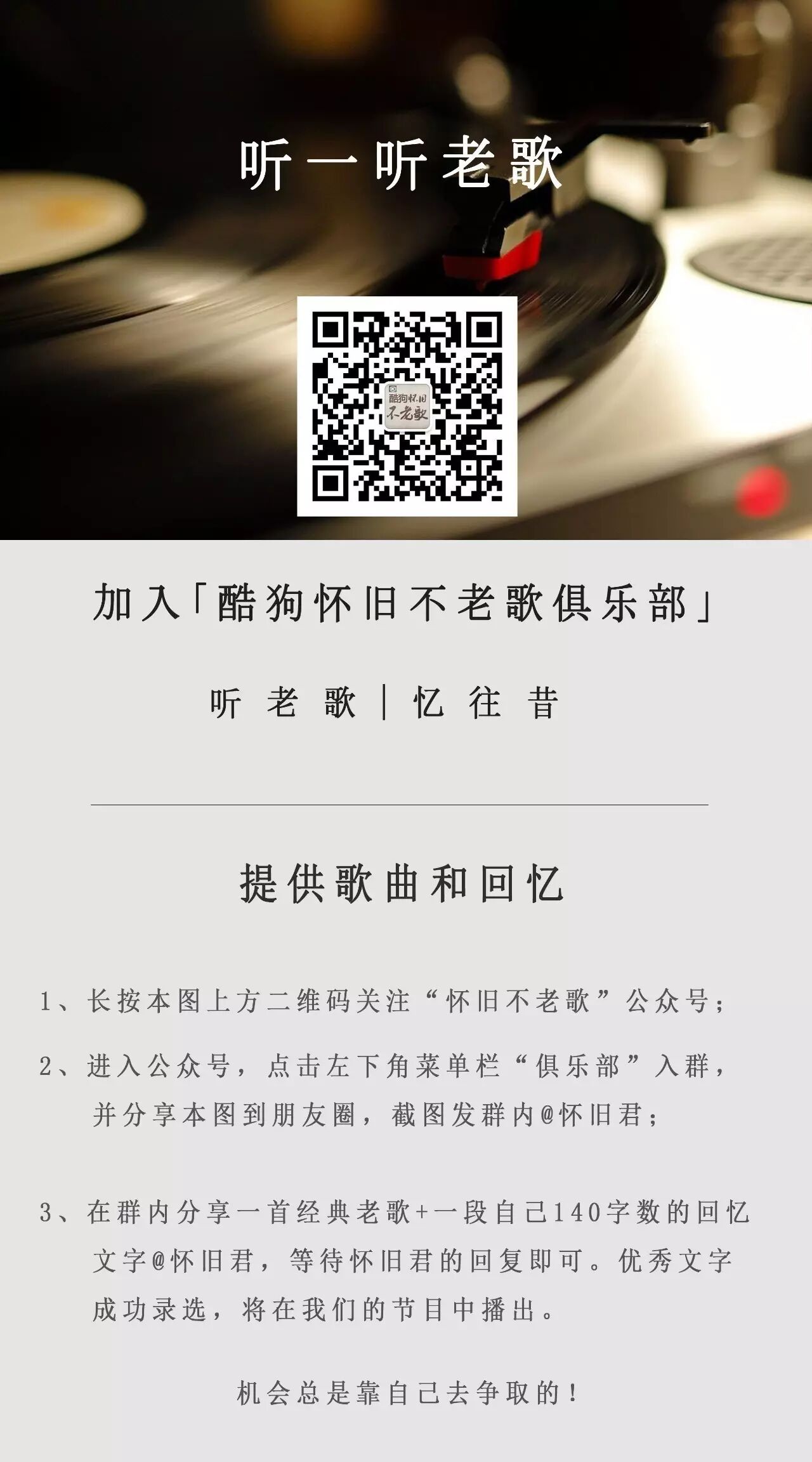 因为编辑稿件是一件蛮费时间精力的事情,所以,我们打算组建一只由喜欢咱们酷狗怀旧不老歌节目的忠实听众给我们提供节目内容。如何加入我们这支怀旧不老歌俱乐部呢?首先你得微信公众号关注“怀旧不老歌”,然后回复俱乐部,扫码进群,就可以了。你只要提供一首歌,并附上自己的一段140以内的回忆发到群里即可。此刻证明你爱不爱酷狗怀旧不老歌的机会到了。零点乐队:爱不爱我,送给现在就扫码加入俱乐部的你们。