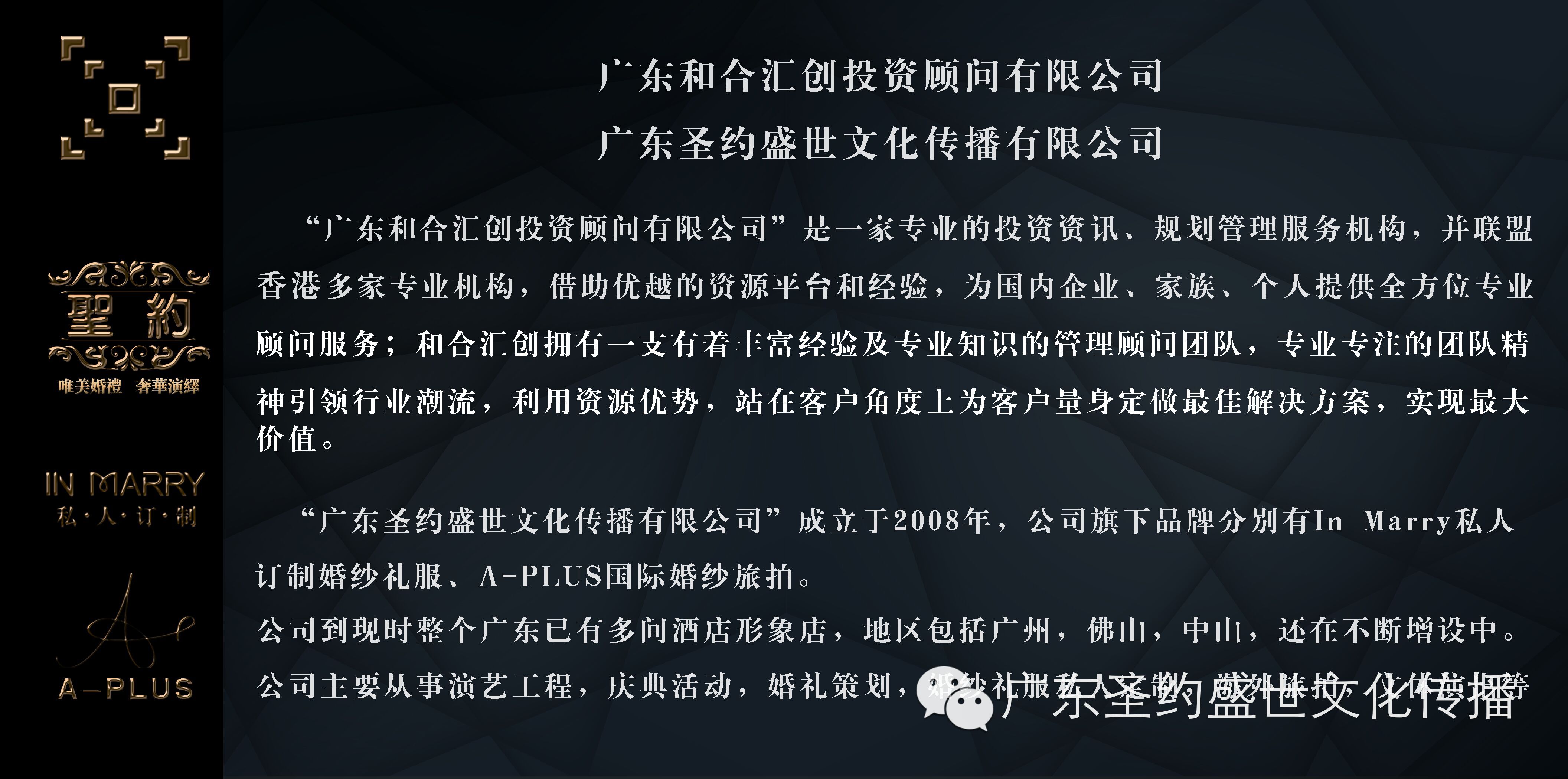 十家一线品牌资深婚礼公司强强联合,只为您的婚礼保驾护航,让您的婚礼办得更轻松满意:广州完美主义皇家婚礼会馆、广州百年好合高端婚礼定制、广州情缘婚礼主题会馆、广州花海阁婚礼策划有限公司、广州市雅芝兰婚礼策划有限公司、广州芝柏礼仪策划有限公司、广州风尚人文婚礼策划有限公司、广东顺德圣约盛世文化传播有限公司、佛山市曼莉婚礼策划、佛山华丽邂逅婚礼庆典策划公司。
