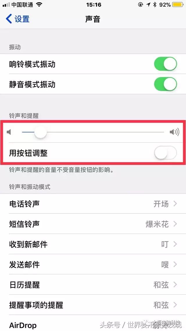 ●如果我们要手机声音与铃声声音分开的话,就关闭“用按钮调整”,然后拖动上方调节音量。