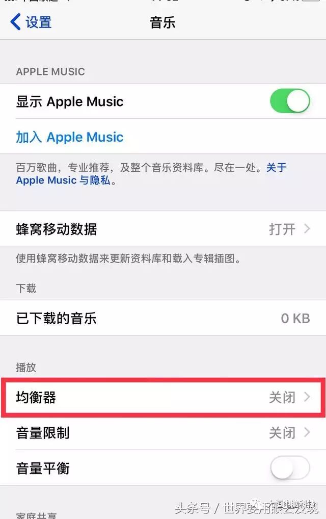 打开设置里的“音乐”,找到“均衡器