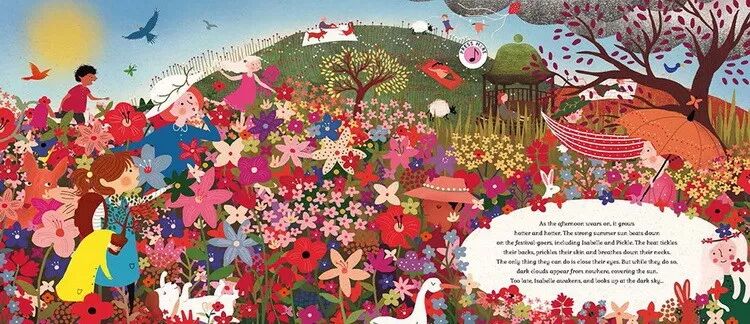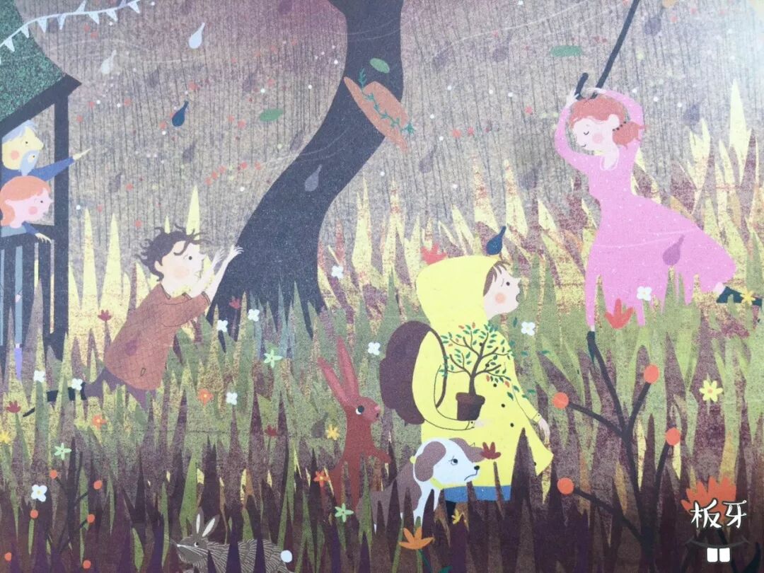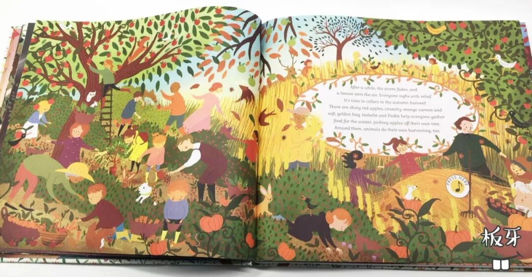 举个例子,随着音乐和画面的四季变化,小女孩Isabelle苹果树的状态也在不断变化;夏季暴雨到来时,小狗惊恐地紧皱眉头……这种惟妙惟肖、细腻的细节在书里比比皆是。