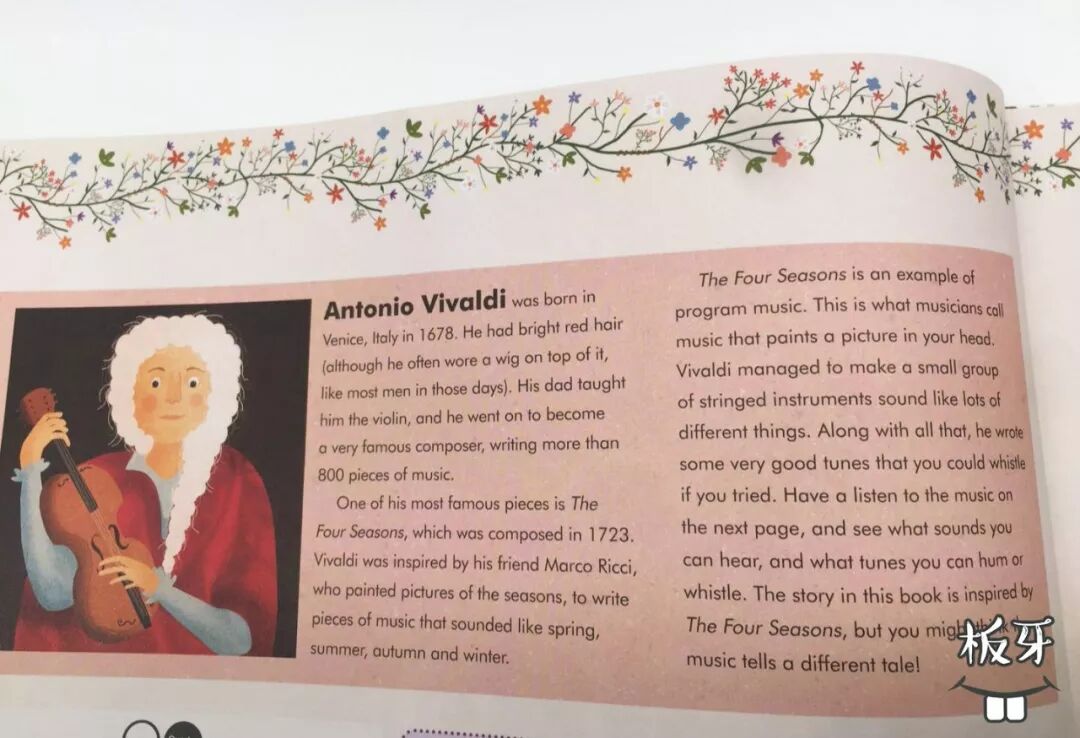 书后还有关于维瓦尔第的个人介绍,孩子可以了解作曲家的基本情况、创作背景和创作理念、音乐的发展历史等等。