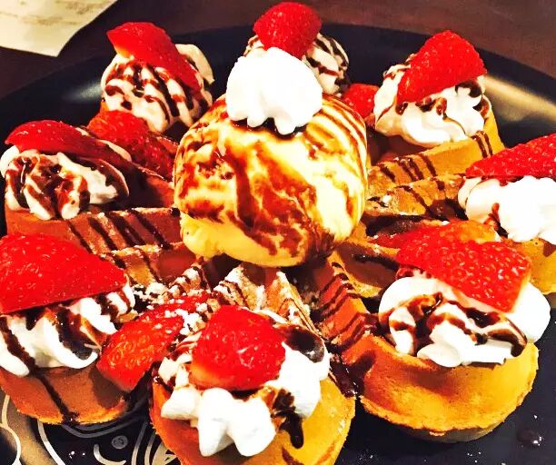 一进店就播放着五月天的歌,仿佛一下回到了校园时光。店里充斥着各种童真有趣的玩意儿,粉红色巴士的咖啡台,可爱搞怪的装饰器皿,特别是那只状似米老鼠的手办玩偶,无一不显示着阿信的孩童心性。店里的甜品也很有特点,最喜欢它家的草莓冰激凌松饼,热乎乎的松饼搭着冰激凌一起,吃起来清清爽爽,毫不腻口,满足感油然而生。