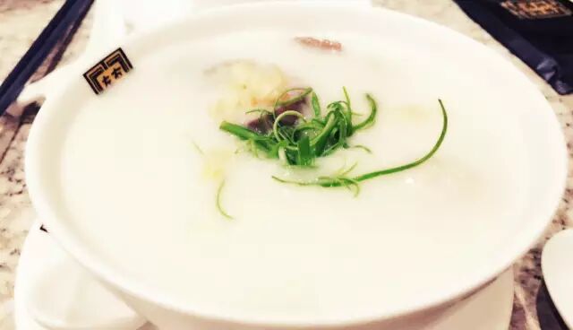 店内装修很有老香港的味道,传统的木制桌椅,黄棕皮的沙发,还有墙面老式的花纹,怎么看都有种回到过去的感觉。正宗的港式十分讲究,比如这及第粥,它家的做法就很正宗,白粥里加入了猪瘦肉丸、猪肝片、猪粉肠和猪肚。色白鲜明,糜水交融,味鲜香厚。白米粥都熬到米粒全化,粥底绵滑,吃起来异常清新可口。