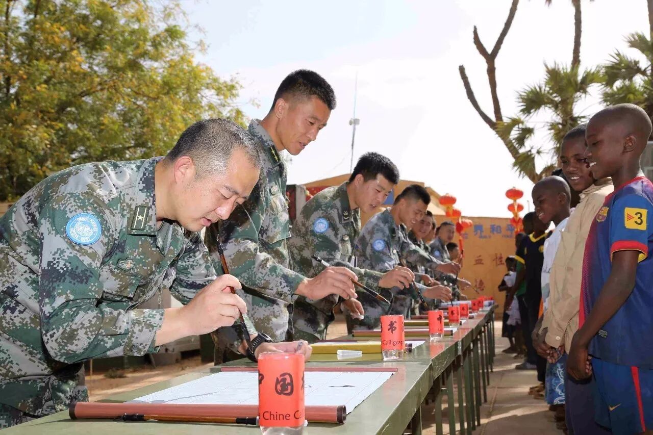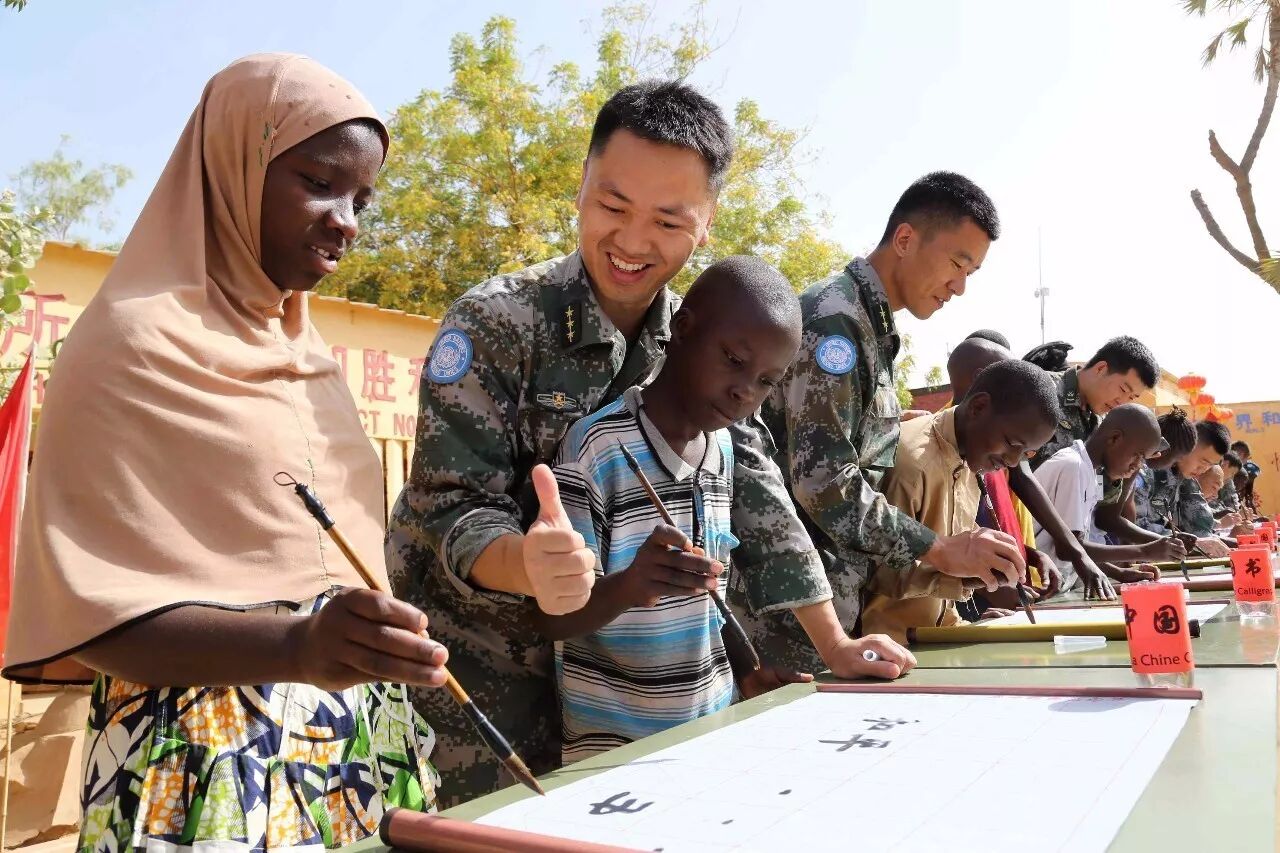 照片中当地小朋友,非常喜欢中国文化,不一会的功夫就学会了汉字写作。大家看到没?孩子们写了“和平”二字,中国军人的守护,给当地带来了和平安定。