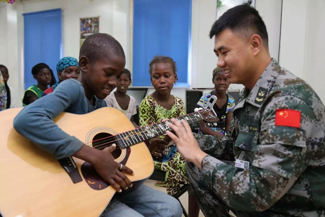 图片右边这位阳光帅气的维和战士,正在向图片左边的小男孩传授吉他弹唱手法,或许刚刚,这个中国小伙弹着吉他给孩子唱了那首《新年好》。