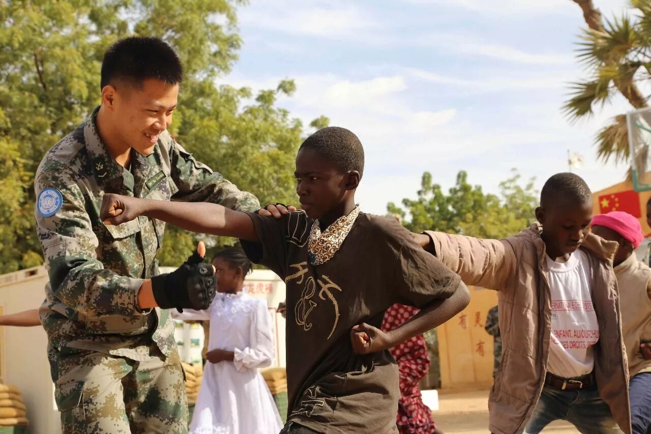 中国赴马里维和部队警卫分队的一名战士,正在向马里当地的小朋友传授中国功夫,看见没,这一拳出的有模有样,引来一个大拇指“点赞”!