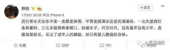 郑钧微博全文:“流行音乐文化在中国一直都是侏儒,不管是摇滚乐还是民谣嘻哈,一出生就肩扛各种重担,三五岁就得养家糊口,结婚生子,代言时代,没有童年没有少年,直接拔苗助长,长出了成年人的肮脏,却只有婴儿脆弱的身体。”这短短几句话就足以看的出作为前辈对于pg one的狠厉批判,这样的嘻哈音乐歌手我们真的不欢迎,出轨、吸毒、约炮,一副享乐主义,让人作呕。