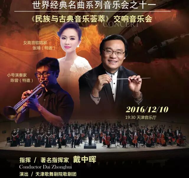 由著名指挥家戴中晖执棒的天津歌舞剧院歌剧团《民族与古典音乐荟萃》交响音乐会,是天津歌舞剧院歌剧团2016年世界经典名曲系列音乐会年底的收官之作。在戴老师的指挥排练下,乐队成员们积极配合,各个声部的演奏状态以及合作意识都有了很大的提高。其中最为经典《柴可夫斯基第四交响曲》,是一首难度很大的交响乐作品,对于乐团的每个声部更是技术与体力的双重考验。经过各声部的分部练习以及戴老师的指导,无论从乐曲本身的技术问题,还是对乐曲的理解的方面也都有了长足的进步。另外本场音乐会还携手了青年女高音歌唱家张璋和著名小号演奏家陈曾,期待12月10日的演出能为您带来一场精彩的视听盛宴!