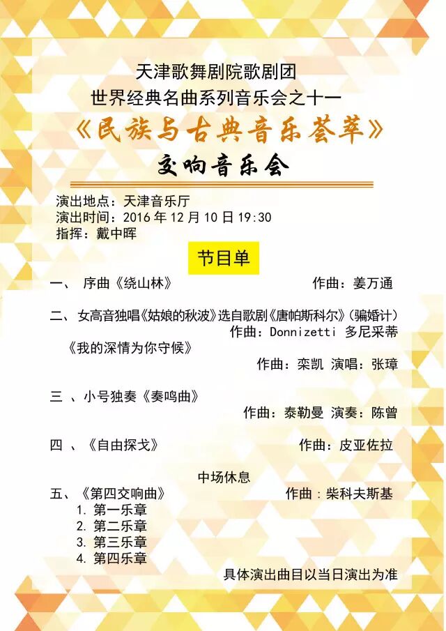 这周六天津歌舞剧院歌剧团在音乐厅上演民族和古典音乐荟萃音乐会,其中的柴可夫斯基第四交响曲,可谓是交响乐中的精品!此曲中每个声部都有困难片段,而且各个乐器在曲中的衔接非常紧凑,有一定的难度,所有的演奏人员都非常的认真,这几天在著名指挥家戴中晖老师的精心排练下,我们团能够比较好的诠释这部经典的第四交响曲,希望能给观众带来一份惊喜和快乐!在此预祝音乐会圆满成功!