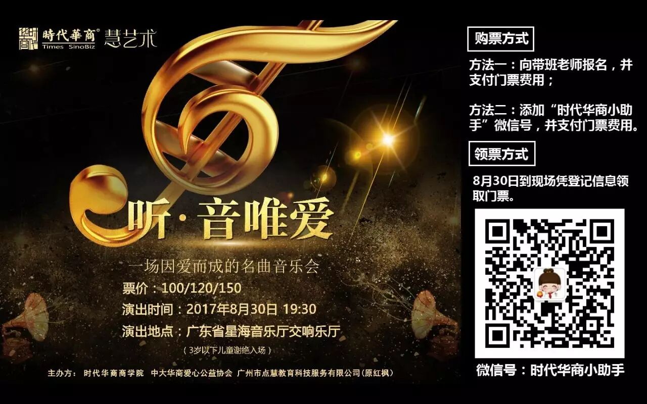 8月30日,时代华商商学院将与中大华商爱心协会、广东省音乐教育共同发起一场公益名曲欣赏音乐会,并与艺培业内顶尖的教育机构和优秀琴童联合举办公益音乐会,既有高水平专业级的作品展演,又有通俗易懂的音乐作品雅俗共赏。