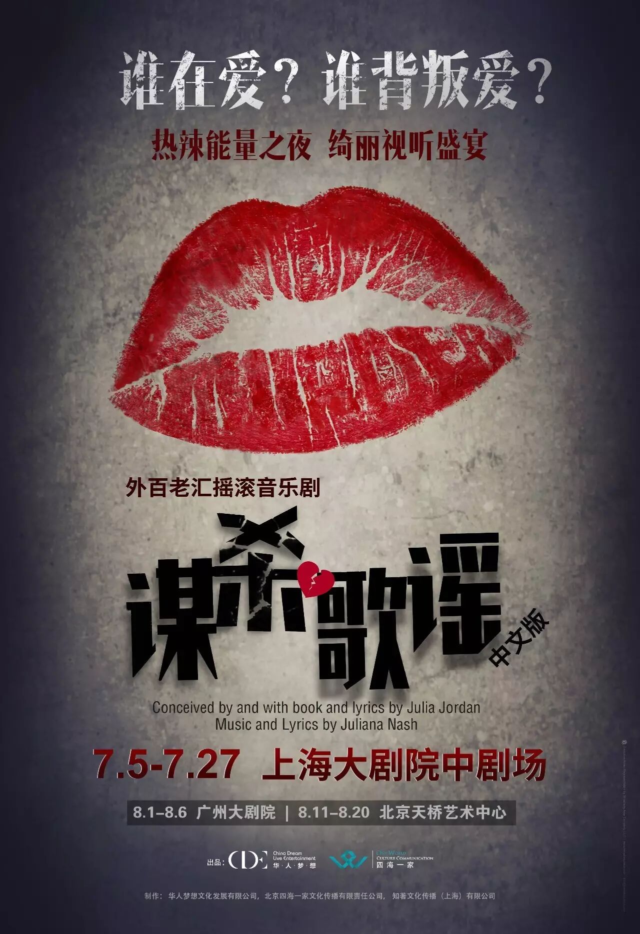 音乐剧《谋杀歌谣》由著名编剧茱莉亚·乔丹(Julia Jordan)撰写剧本,茱莉安娜·纳什(Juliana Nash)负责词曲创作,冠军歌手苏诗丁、音乐剧小王子冒海飞倾情加盟。