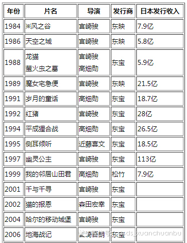 (表格中的金额单位为日圆。在日本,1999年之前都是计算“发行收入”,2000年才改为计算“票房收入”。所以无法类比统计)