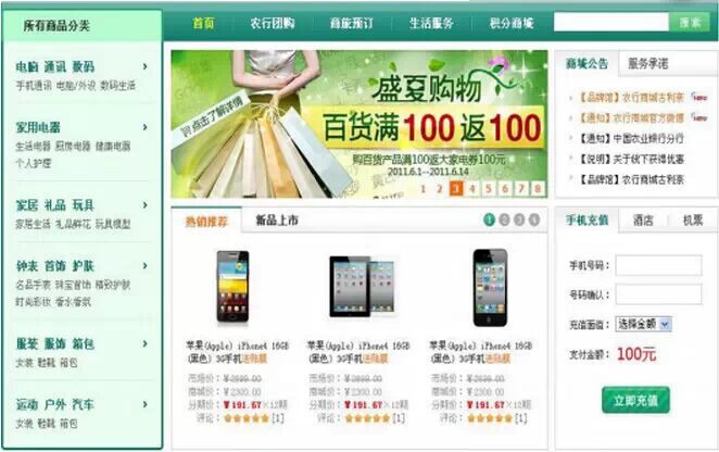 通联为合作银行建设银行专属网上商城,可设置为银行官网子域名,通联提供包括商品、商户、物流、客服在内的全方位整体服务。以“网上商城”作为运营平台,结合银行及通联支付的资源,发挥并建立银行卡在线服务的差异化优势,包括但不限于“信用卡分期购物”、“线下商户在线团购”、“全国交通罚款代缴服务”、“电影票在线预订”、“企业客户商旅预订的特色服务”等等。
