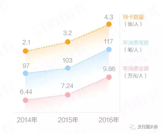 某专业信用卡平台发布的《2016 信用卡活跃用户消费报告》指出,截至 2016 年底,活跃信用卡用户的人均持卡量已增至 4.3 张,较 2015 年增长 34.38%。与此同时,活跃信用卡用户的人均年消费金额也从 2015 年的 7.24 万元增加至 9.86 万元。