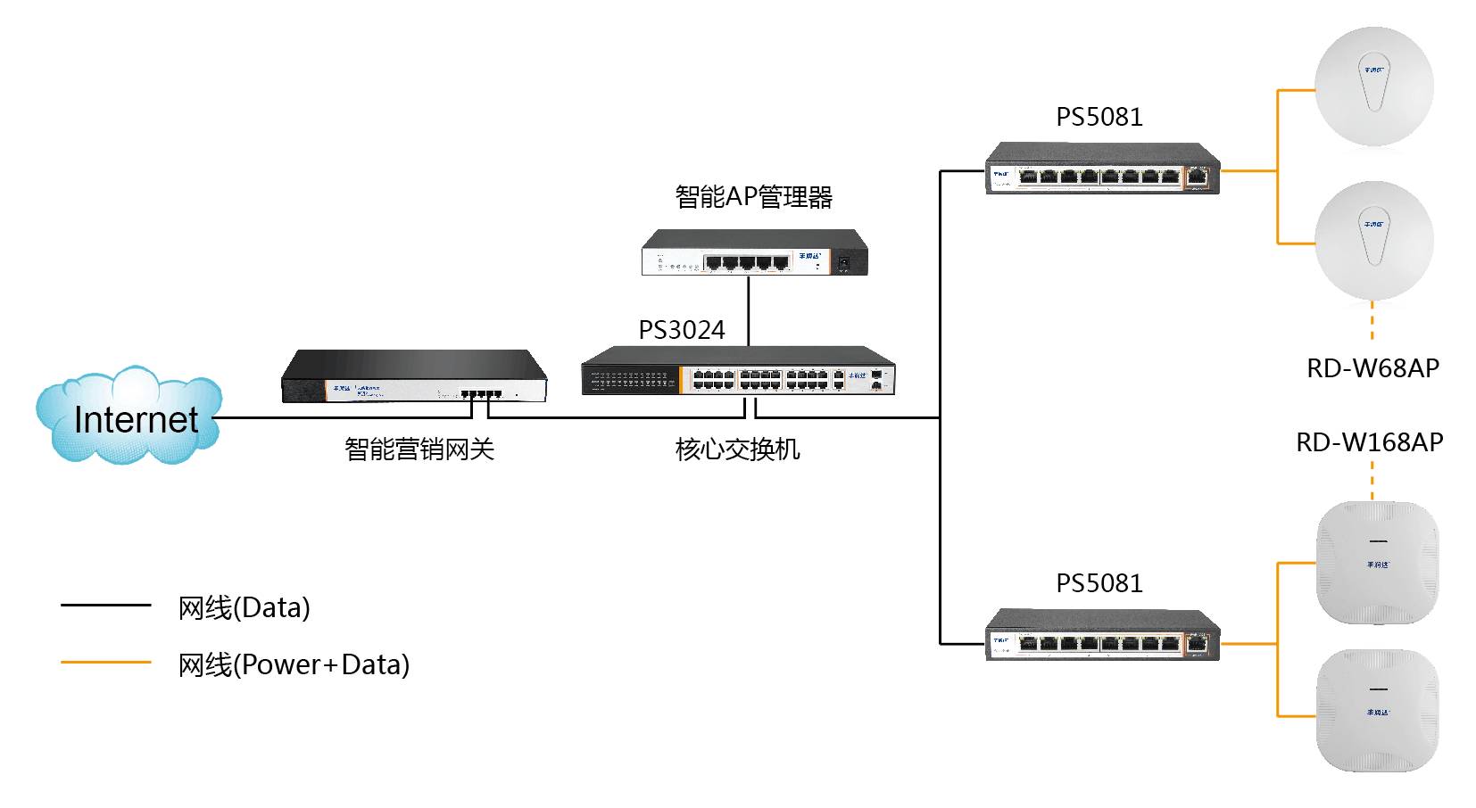 3、甄味生鲜超市人流比较密集,在无线覆盖方面,方案选择了丰润达RD-W168AP及W68AP。W168AP为双频吸顶式AP,支持同时运行2.4G和5.8G两个频段,信号强劲,超强用户接入能力。带机量、无线速率是普通AP的两倍,是甄味鲜生生鲜超市这样人流密集场所的WiFi覆盖不二选择。