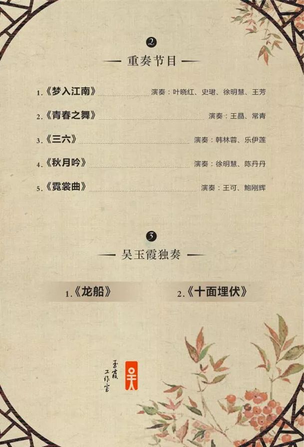 演奏会上,来自吴玉霞高研班的11位学员将带来他们的独奏和重奏,大师吴玉霞更是压轴登场,为大家带来《龙船》和《十面埋伏》。