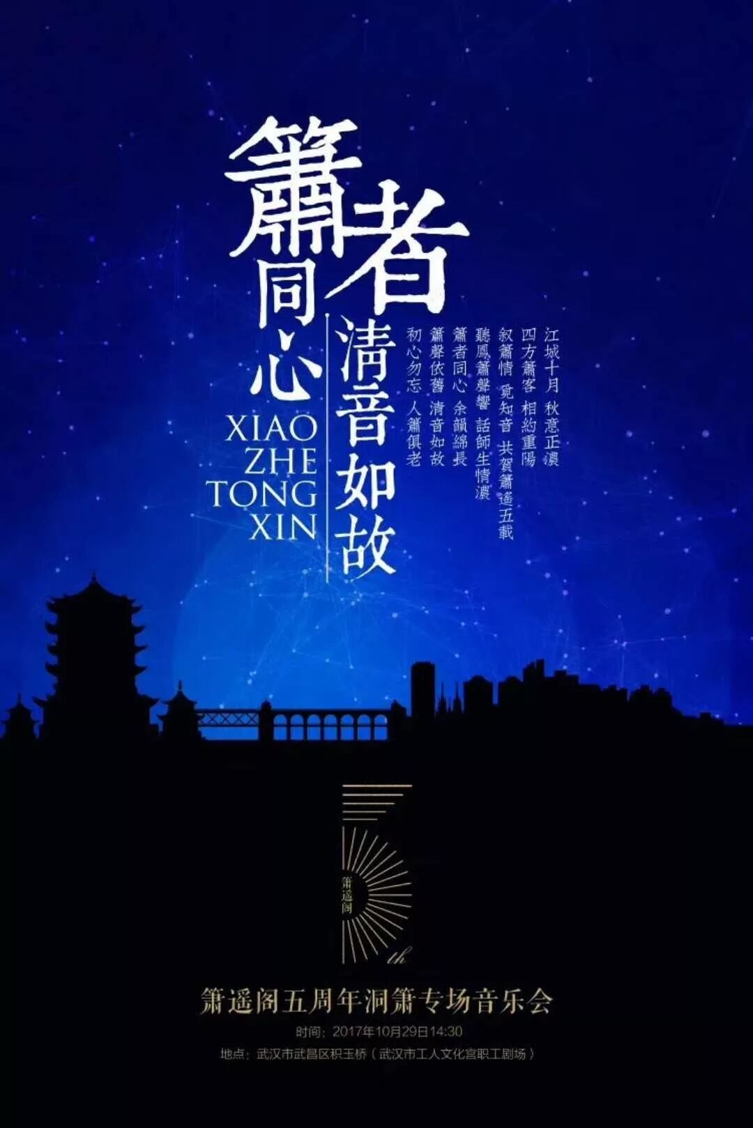 今宵,我们,一群钟情洞箫的人,一群热爱音乐的人,一群传承民族艺术的人,一起回顾共同走过的五年足迹,一起畅谈弘扬洞箫艺术的心曲,一起分享这直抵心灵深处的美妙声音。