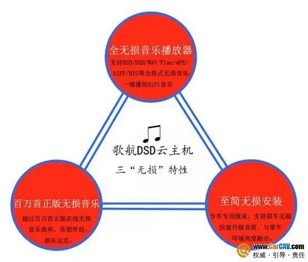 歌航DSD云主机作为国内首款支持DSD/DXD音乐格式的车载HiFi高清无损播放器,以高清HiFi发烧音质,彻底改变了CD机统治车载音响主机市场的局面,而且革命性地将互联网嵌入到汽车音响主机中,将音响主机与汽车环境融合为一体,加上无损安装、便捷操作的使用特性,改变了汽车音响给普通大众高深玄妙的陈旧印象,让车主听得真、看得懂、用得顺、买得起。歌航DSD云主机,通过简简单单的操作,将高清HiFi音乐一键放送,让店家和车主远离倒模和调音的烦恼,用最简单的方式改音响,以最简单的方式享受HiFi音乐。