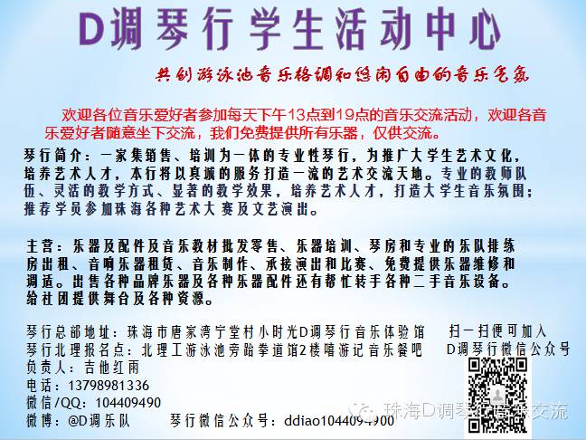 欢迎免费参与北理工D调琴行吉他与音乐交流会,这里是北理北师和珠海各位音乐爱好者和音乐教师音乐制作人乐队聚集交流平台,也可加入到这里的乐队和排练房一起学习和交流音乐,也可以免费享用琴行属下的各种设备和排练房,也会定时提供各种珠海大大小小的商演和演出比赛和组织各种音乐活动,给玩吉他和玩音乐学作曲编曲的朋友们提供一个免费的平台,一起交流和学习音乐创造北理最高水平的音乐和音乐气氛最好的音乐交流平台欢迎报名参加,报名完全免费,报名方式如下。