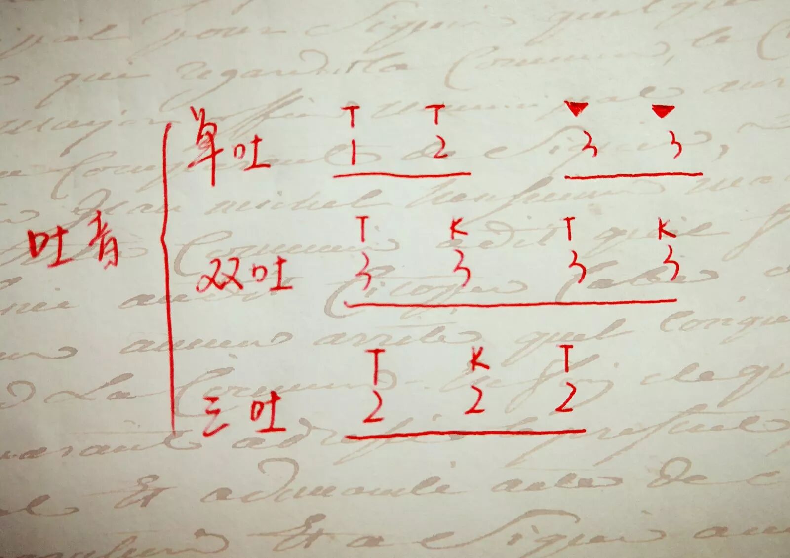 首先是吐音,吐音又分为单吐、双吐和三吐。单吐的标记为“T”,在标有顿音记号或跳音记号的地方均可使用单吐;双吐的练习步骤和单吐一样,只不过增加了一个舌头的动作,单吐时念“吐”,双吐需要念“吐库”两个字。双吐标记为“TK”,和单吐一样,在标有跳音、顿音标记时也可使用。