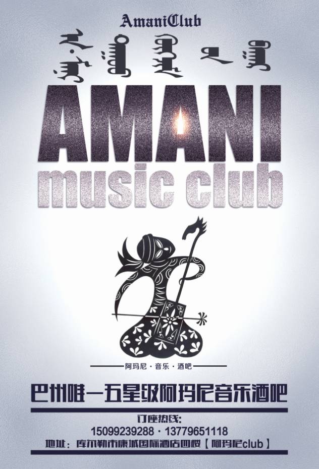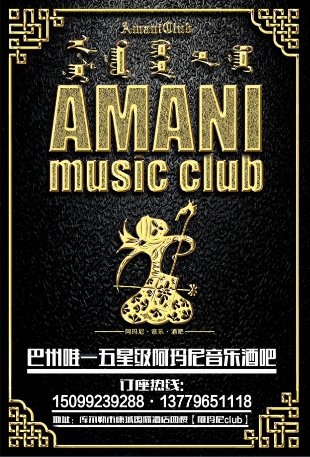 精彩的音乐现场演出。品种多样货真价实的酒水,五星级的感觉大众的消费。时尚前卫精致舒适的装修。我和胡日查是十几年前是个最好的兄弟,也是最好的朋友,曾经我们一起玩音乐一起同甘共苦,一起奋战在音乐的道路上,羡慕那时候在一起的时光,胡日查通过几年的努力成为了影响世界的著名中国乐队【杭盖乐队】,感谢兄弟【胡日查】将5月6日---8日亲临库尔勒【阿玛尼·音乐·酒吧】让我们期待【胡日查】的到来!