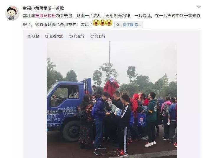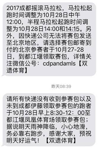 此次成都摇滚马拉松赛前领物点分为三处,虽在报名时需选择一处作为领物点或选择邮寄,但领物时因没有短信通知部分跑友并不清楚自己所在领物点或邮寄包丢失,导致大量跑友无法领取属于自己的芯片和号码簿。直接导致赛事当天上午有大量跑友在现场领取物资,领物现场一度混乱。
