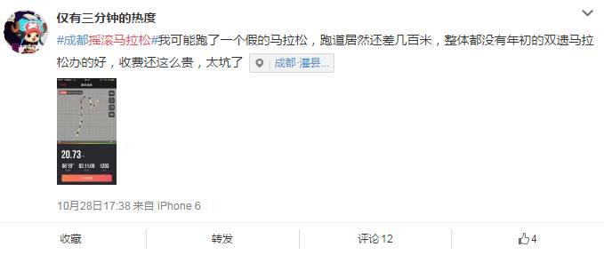 据部分跑友反馈,此次成都摇滚马拉松出现赛道距离不足,半马没有达到规定公里数,该成绩可能将不能作为今后马拉松参赛历史成绩证明。(该赛事目前暂未在中国田协认证)