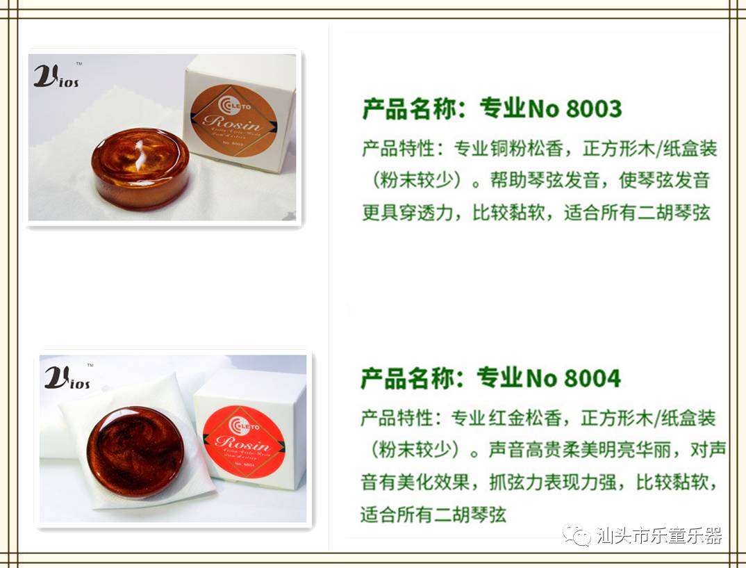不同品牌的松香其硬度略有差异,软的松香会让琴弦震动的更好,但因为太黏,容易产生杂音,而稍硬的松香附着力又不如质地较软的松香,但不粘弦,二者各有利弊,如何选择还要看个人的演奏习惯而定,好的松香尘小而且易上不易脱落,反之尘大而且不易上较容易脱落。