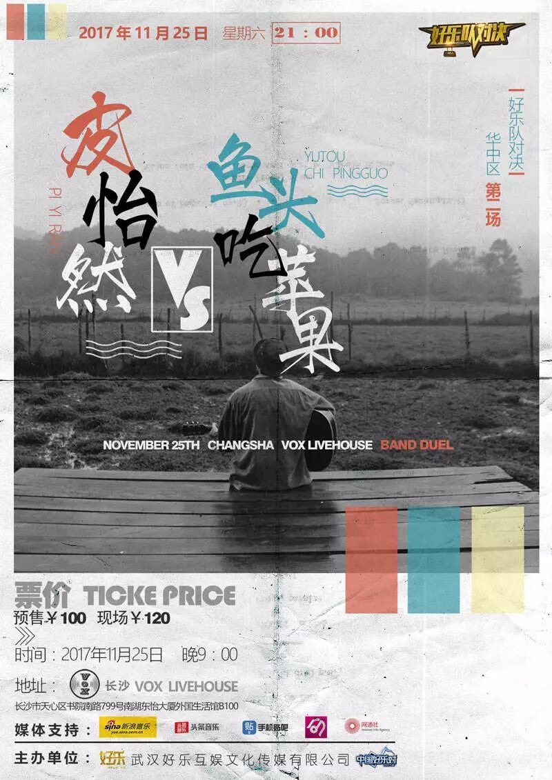 好乐队对决华中区第二场:皮怡然 VS 鱼头吃苹果乐队周六将在长沙vox live house上演。