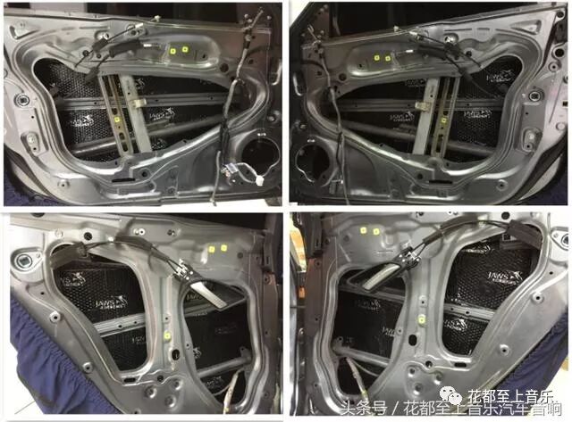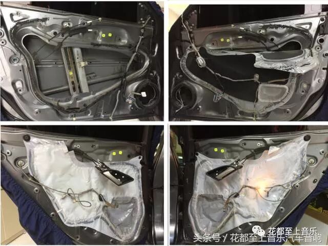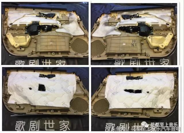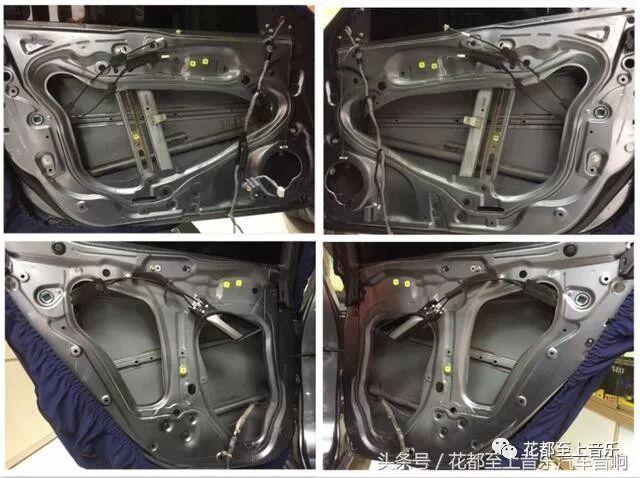 升级音响之前,喇叭对密封性要求是很高的,但是汽车的门板偏偏是薄而且孔洞很多,隔音是必须做的,隔音好处为门板减少风噪,打造一个更加密实箱体,让门板升级的专业音响能够有一个合适的工作箱体,拆除门板大家可以发现门板钣金处是没有任何隔音,表面也仅仅有一层透明胶,我们会清洗好门板,让隔音能牢牢的贴紧门板。