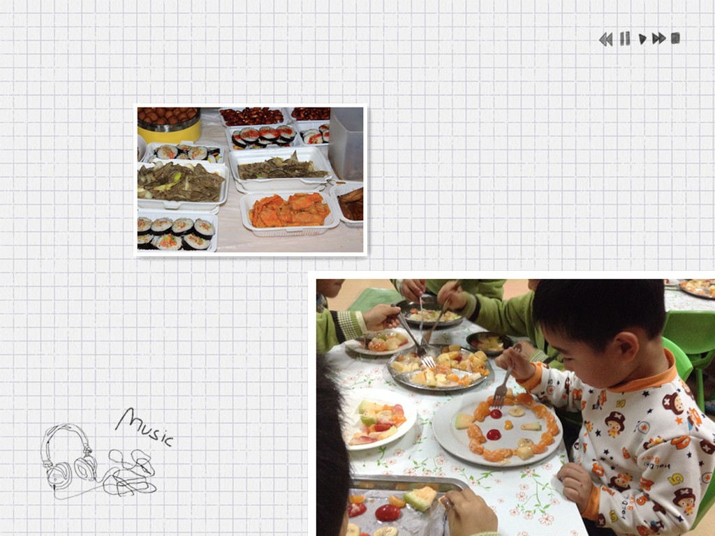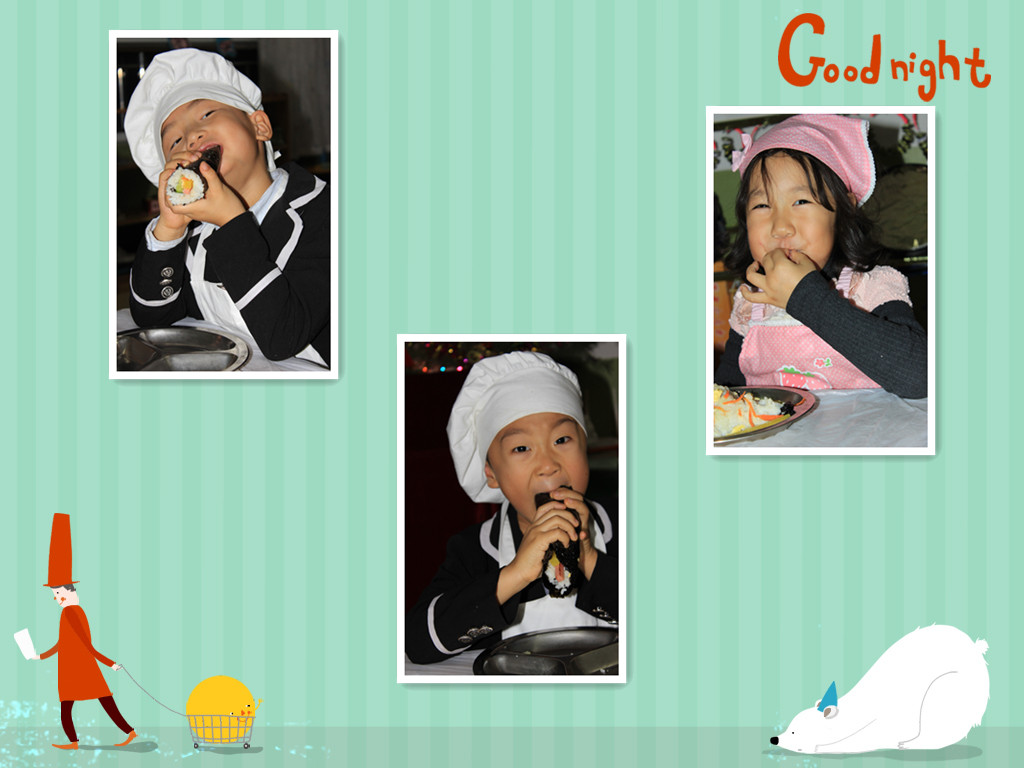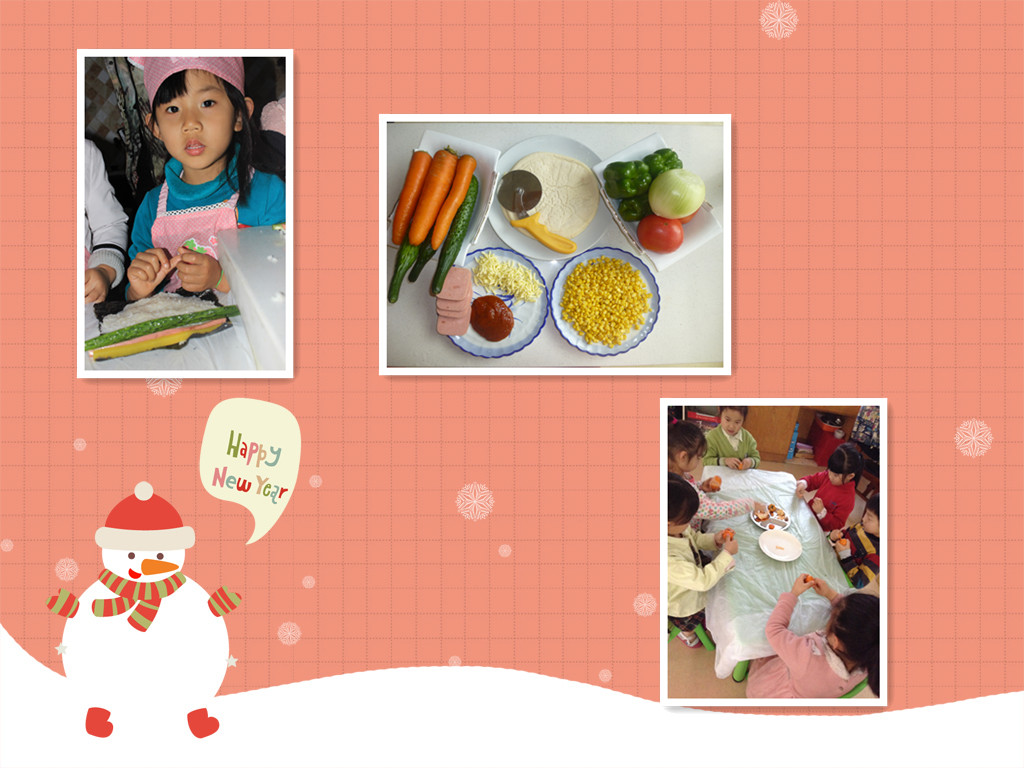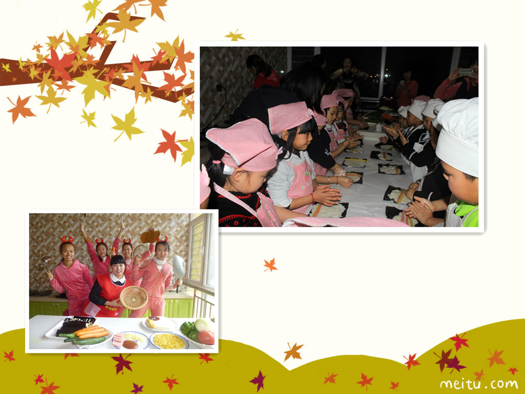 老师们也为孩子们准备了许多有趣的活动:我们一起自己亲手制作披萨,紫菜包饭,水果沙拉,孩子们忙得不亦乐乎,烹饪大师们忙完后,津津有味品尝着他们自己做的丰富、美味的晚餐。用餐后老师带领孩子们表演节目,大家非常开心。