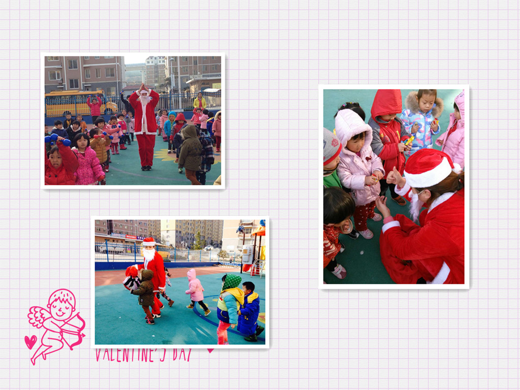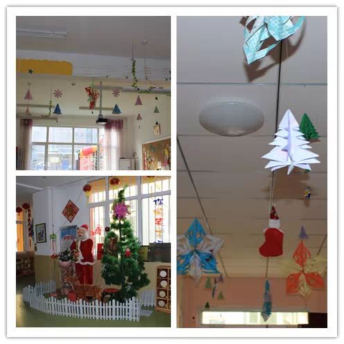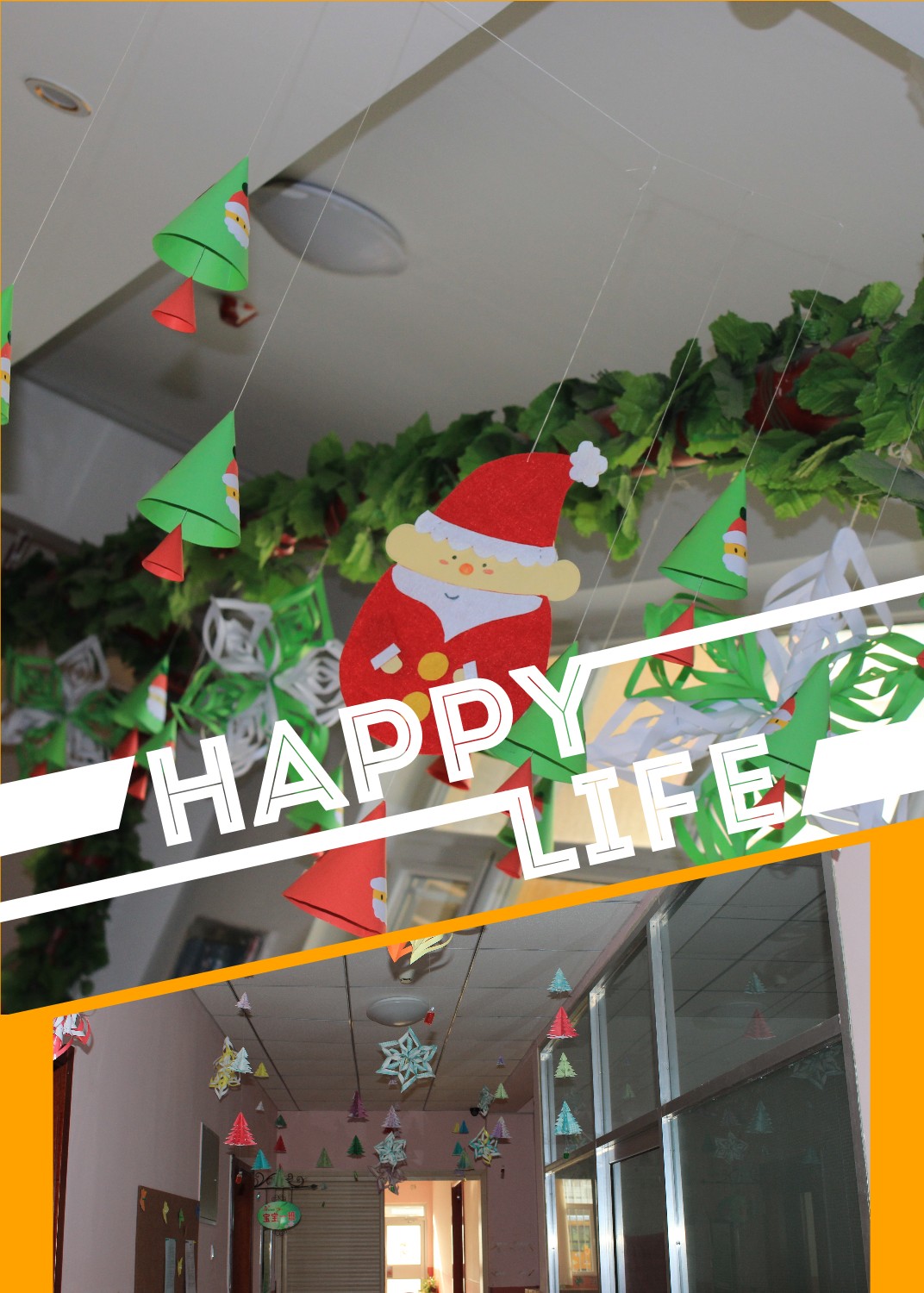 为了在园内营造圣诞节的气氛,在圣诞前夕,老师在园内布置了走廊,每一个小雪花和圣诞树的小吊饰都是老师们亲手制作的,每一个都传递是满满的爱,结合冬的主题与圣诞节的主题幼儿与教师共同参与布置的主题墙,让幼儿在看一看、说一说、玩一玩的活动过程中,获得知识与技能。老师在幼儿园大厅还布置了圣诞树,极力营造圣诞气氛。12月24日,在快乐、温馨的幼儿园里,处处透露出圣诞的欢乐气氛!圣诞树、圣诞老人和欢快的圣诞歌烘托出了浓厚的圣诞气息……整个幼儿园共同沐浴在欢乐的海洋中。