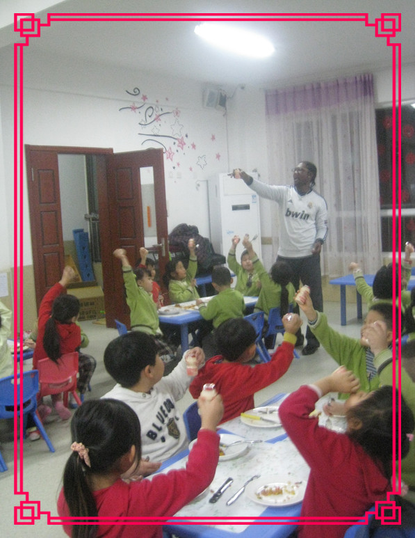 瞧!这又是谁?原来是我们的外教老师杰夫要和我们一起度过平安夜,孩子们和老师分享我们自己做的披萨,杰夫老师用不算流利的中国话说:“怎么比柜子都硬····”哈哈~ ~ ~