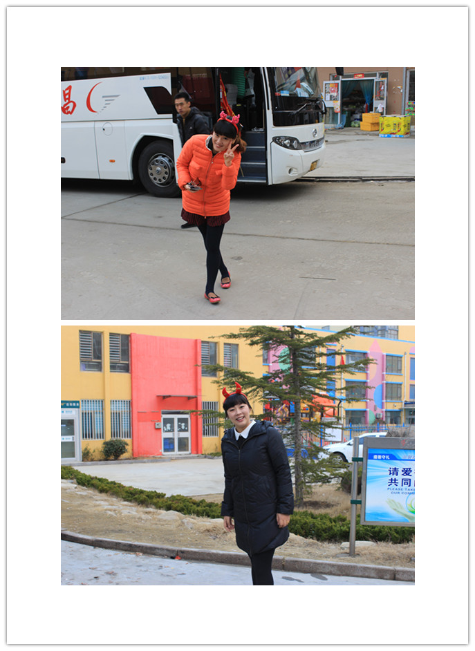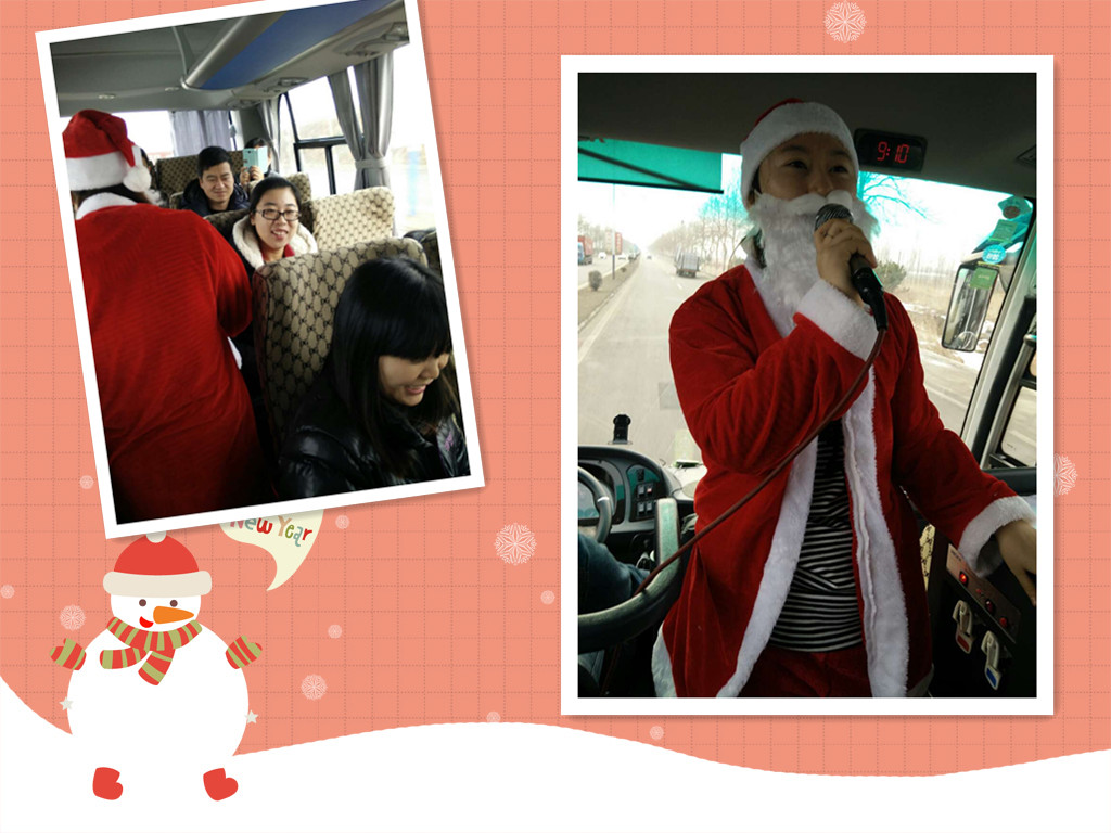 瞧!家长和孩子们已经整装待发,他们这是要去哪里?原来为了庆祝圣诞节家长们自发组织了亲子滑雪活动,大巴车上老师们组织家长朋友和孩子们表演节目,猜谜语等等,其乐融融~ ~ ~ 哇!怎么圣诞老人被我们的欢乐气氛吸引来了吗?她也出现在我们的大巴车上~ ~ ~ 这简直是天大的惊喜哦~ ~ ~ 孩子们欢呼起来~ ~ ~ 圣诞老人还给我们送了平安果哦~ ~ ~ (孩子们还发现了一个秘密:嘘~ ~ ~ 圣诞老人还有黑色的头发哦~ ~ ~ )伴随着欢歌笑语我们来到了山泰生态园,蓝天,白云,风车,和一望无际的雪场~ ~ ~ 大家在美如画的滑雪场里玩的很嗨哦~ ~ ~ 在玩中孩子们学会了谦让学会了交往学会了分享。最后我们还参观了草莓园,知道了无土 也可以栽培草莓哦~ ~ ~(待到草莓成熟时,我再来~ ~ ~)