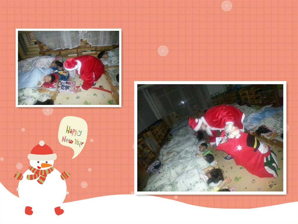 半夜老师们装扮成圣诞老人把礼物送到了孩子们的床头。