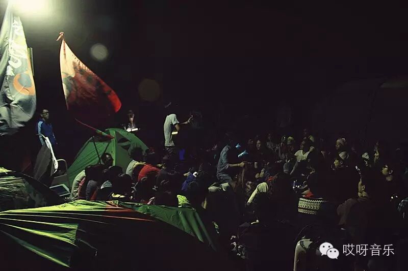 对,就是上面那个长的像逼哥的人,抱着吉他一晚上没松手。而我一个南方小男人,又不能像山东哥们一样敞开了在人群中伴舞。就连身边的红领巾小哥都因为放了一个冲天炮而吻到了身旁的妹子。没有冲天炮的我在喝完了最后一罐啤酒摸回了帐篷。