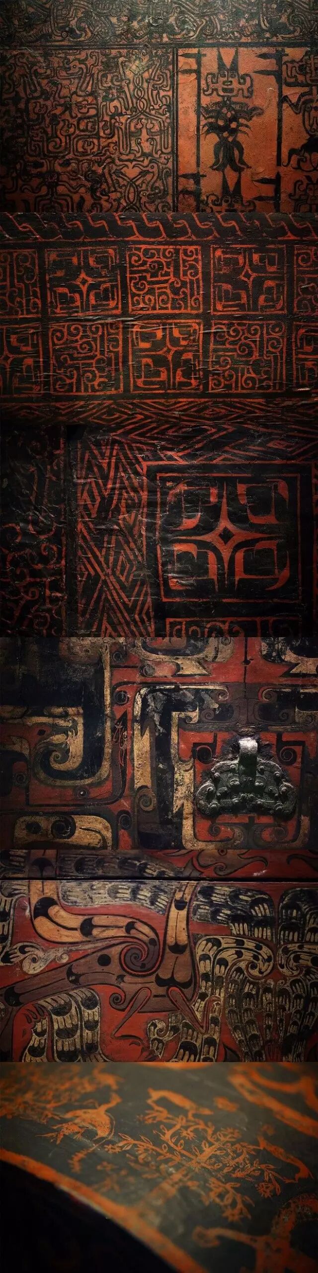 以下就是曾侯乙墓出土的漆器,线条装饰感很强烈,所绘的造型大多经过夸张和特征截取,颜色冲击感很强,极为美丽!