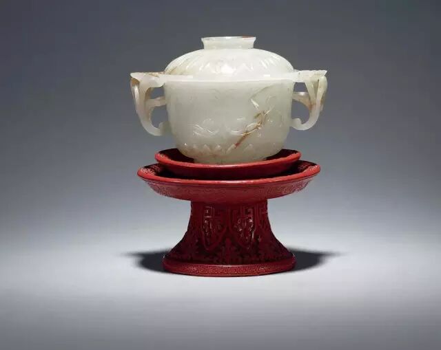 ▲ 清乾隆 白玉螭龙茶碗及碗盖 剔红花卉盏托