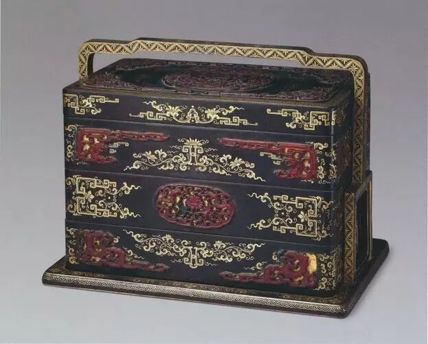 ▲ 清中期黑漆描金嵌蜜蜡夔凤纹提匣 故宫博物院藏