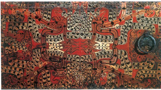 ▲ 图为战国彩绘龙凤纹漆内棺,出土时漆彩如新,棺上图案为龙纹交叠于凤纹之下